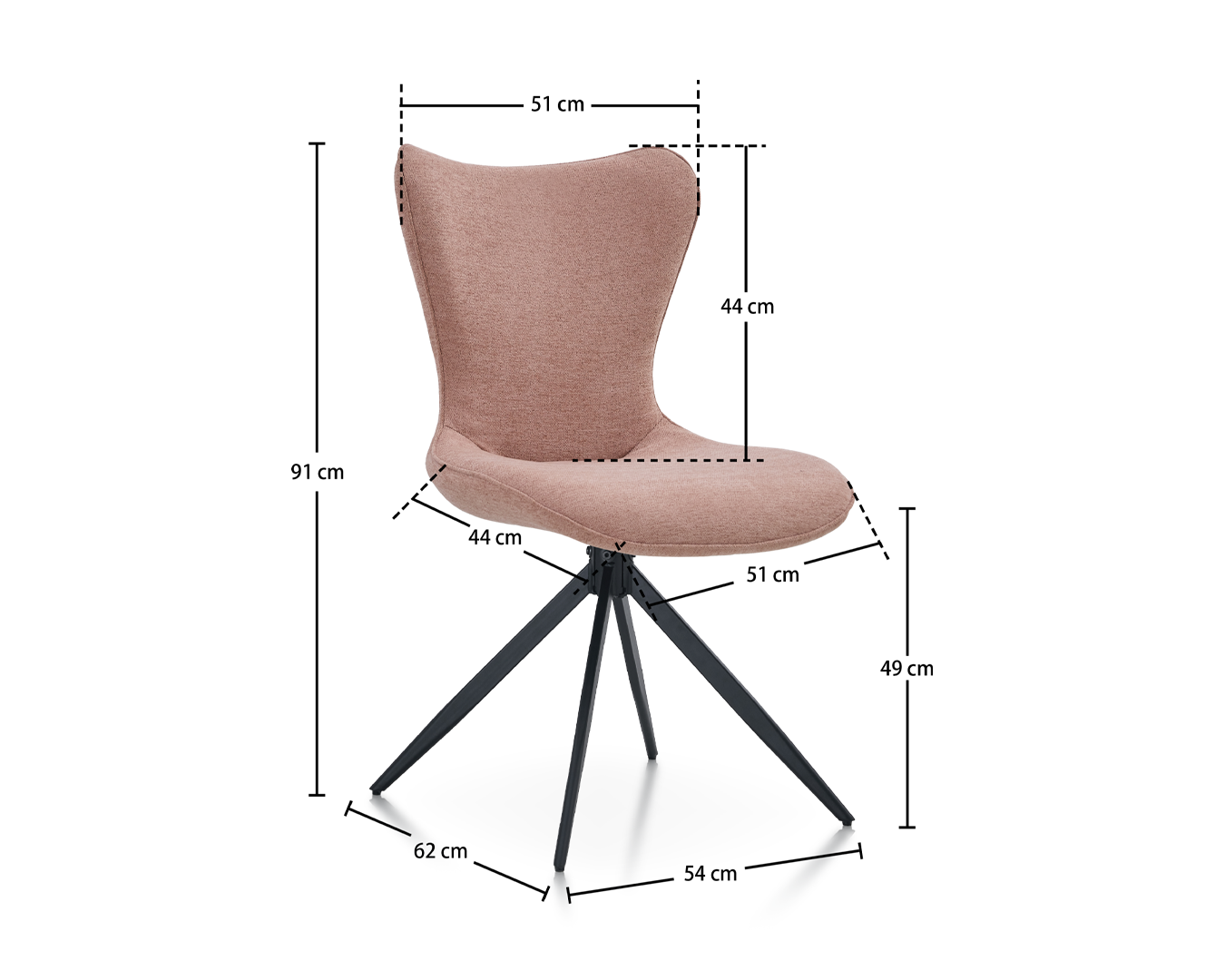 • Tapificat într -o țesătură roz moale, fard, oferă o experiență confortabilă de ședere, adăugând în același timp o notă de rafinament în orice spațiu de luat masa. Designul elegant al scaunului este completat de baza sa robustă de metal negru, care nu numai că oferă stabilitate, dar și își îmbunătățește atracția contemporană.