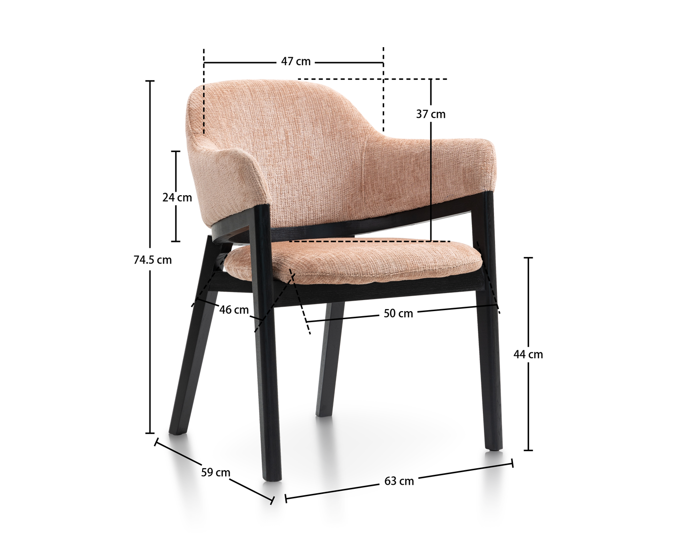 • Fiecare componentă a acestui scaun a fost realizată meticulos de artizani calificați, asigurându -se că respectă cele mai înalte standarde de calitate și durabilitate. Cadrul de lemn de cenușă, finisat într -o culoare neagră elegantă, evidențiază frumusețea naturală a materialului, adăugând în același timp o atingere modernă. Scaunul și spătarul de pluș, tapițat sunt confecționate dintr-o țesătură moale de înaltă calitate, care se simte primitoare și confortabilă.