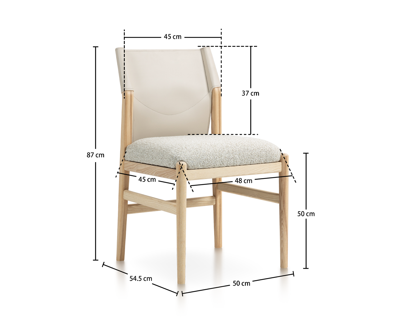 • Cadrul realizat din lemn de cenușă de înaltă calitate, prezintă frumusețea naturală și durabilitatea materialului, cu finisajul neted și modelele subtile de cereale care adaugă căldură oricărui spațiu interior. Backrestul din piele de șa oferă o notă de lux, oferind atât stil, cât și suport. Textura sa suplă și culoarea bogată completează designul general al scaunului, ceea ce îl face o alegere ideală pentru cei care apreciază măiestria fină.